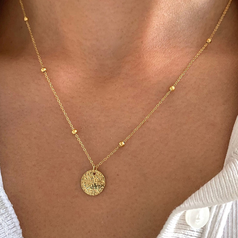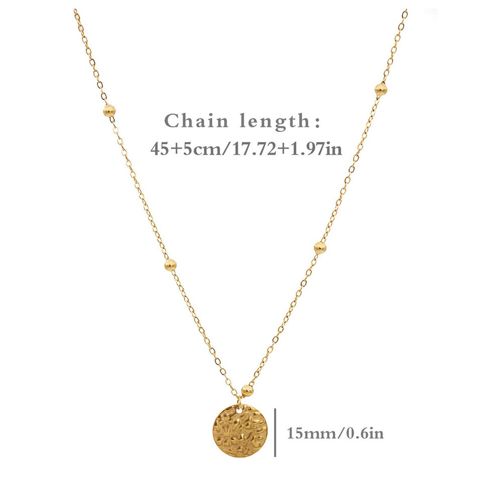 This necklace features a simple round disc design, incorporating exquisite embossed textures and 18K gold finish, presenting a low-key yet sophisticated and luxurious style. The round disc pendant reveals delicate textures under light, adding depth and sophistication to the overall design.
